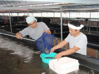 日高さんの養魚場は、ハウス内にコンクリート水槽を20基設置し、地下水を汲み上げ飼育しています。県内水面研究所と連携し、水槽に泥を入れない大量養殖に成功し、年間3t程を出荷できるようになっています。