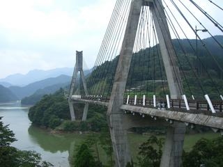 轟地区から国道326号を宮崎方面に5分ほど車でいくと、北川ダムに架かる「唄げんか大橋」が見えてきます。逆Y字型の主塔と斜めに張ったケーブルの幾何学的な造形美が周囲の自然やエメラルドグリーンの湖面に見事に調和し、絶好の観光スポットとなっています。